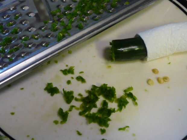 La reja es mucho más simple que picar. Es más rápido, no cortarse accidentalmente y no necesita guantes de látex cuando manipule chiles calientes. Simplemente Envuelva una tira de toalla de papel alrededor del extremo de vástago y sostener la pimienta allí. El serrano se ralla wholey, piel incluida.