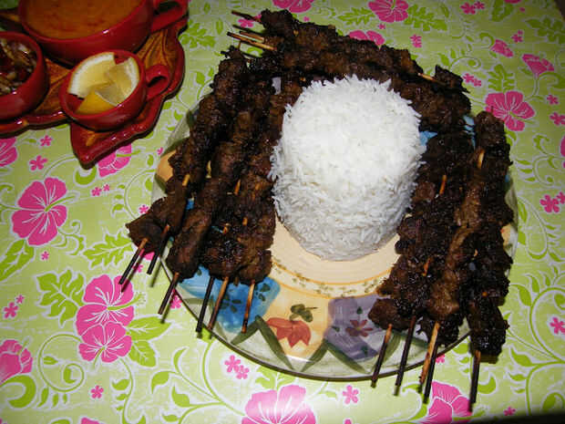 Grill/asar brochetas hasta que esté cocido (bajo parrilla en horno llevaría cerca de 30 minutos, girando una vez o dos veces)