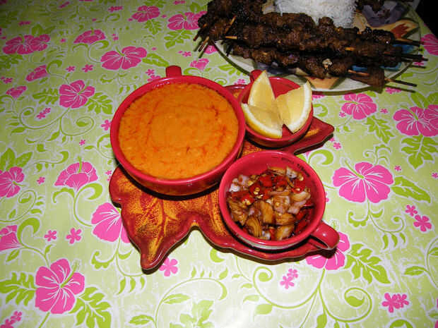 Picante salsa de soja dulce (una mezcla de salsa de soja dulce con chiles ojo de pájaro fresco en rodajas y echalotes--> unos 8 chiles ojo de pájaro, 5 chalotas y 5 cucharadas salsa de soja dulce, Indonesia marca preferentemente llamada ABC, disponible en las tiendas asiáticas)