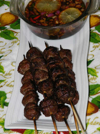 Mezcla de carne molida de res con pasta, combinan bien. Forma bolas e hilo de rosca a los pinchos.