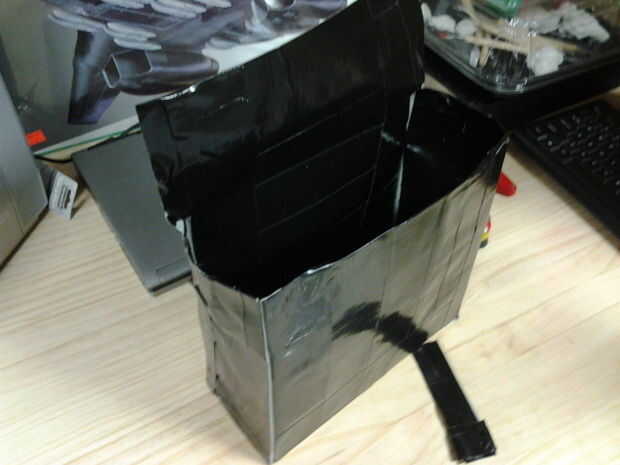 Ahora después de pegarse todo junto, usted debe tener algo parecido a esta imagen de arriba. La pequeña franja negra en la parte inferior es una tira con una bolita de lado pegajoso de la cinta, que luego cinta en la parte superior del panel alto.