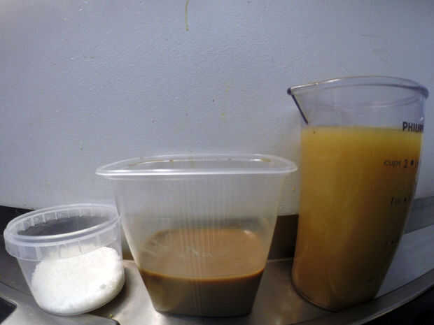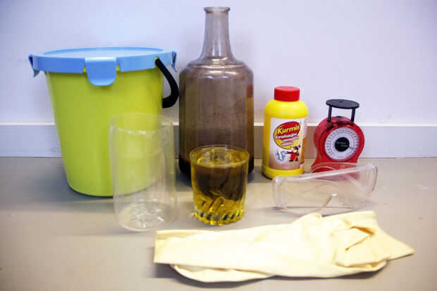 - 66 gramos de lejía (químicamente conocido como NAoH y comúnmente encontrado como cristal desagüe limpiador).