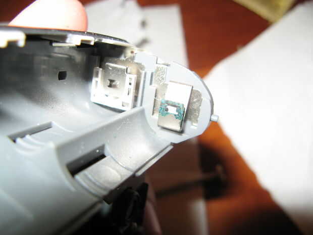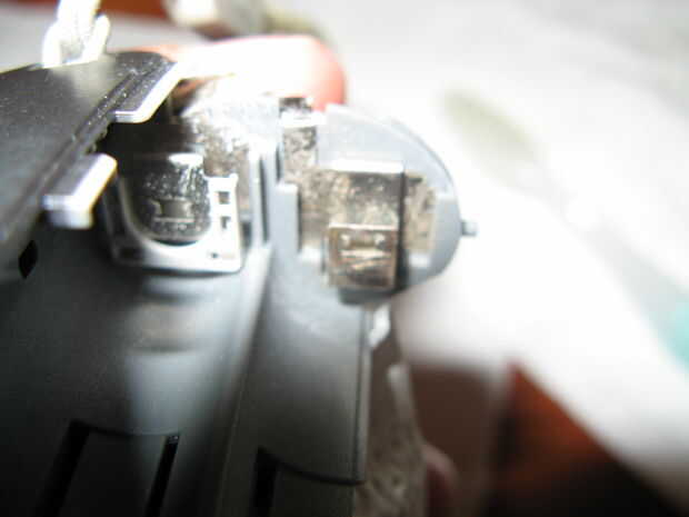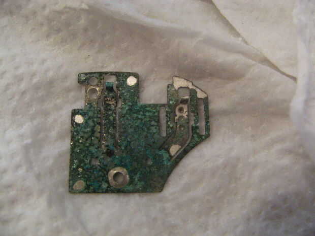 3. Frote los contactos duros (Asegúrese de deshacerse de la capa verdosa) ADVERTENCIA! Tenga cuidado no se cualquier componente eléctrico húmedo.