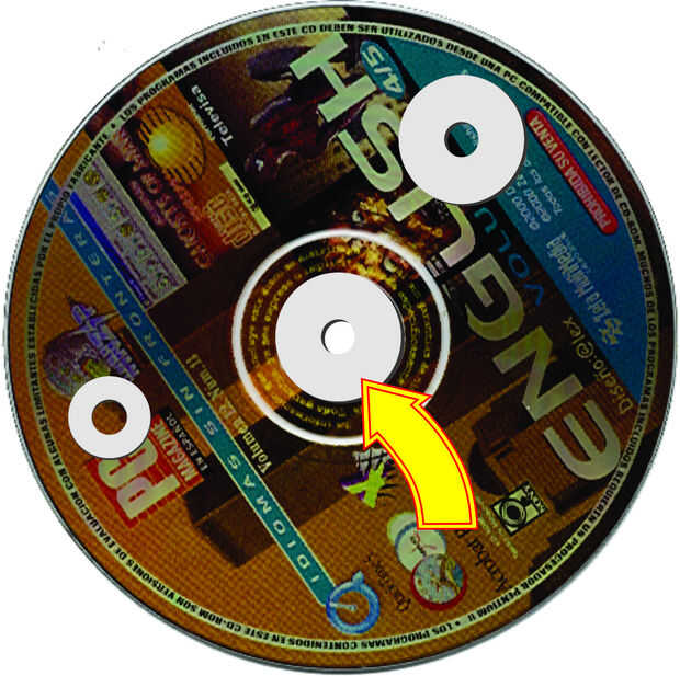 Pegue s las arandelas mas grandes sobre las pequeñas en el centro del CD - DVD, en el lado de afuera de cada CD o DVD. Deje la
