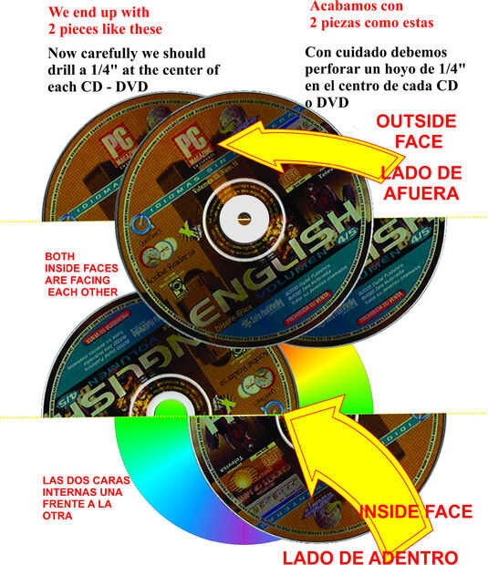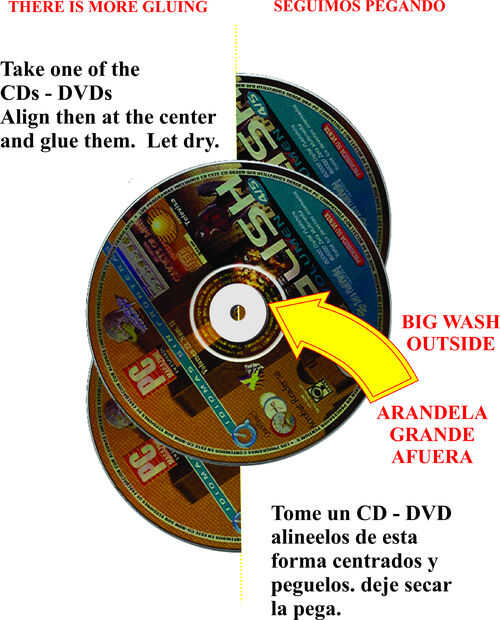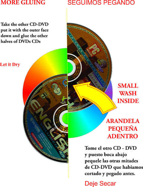Juntamos uno de los CD ' s con una de las mitades pegamos en el paso 4, les ponemos suficiente pega y los dejamos secar.