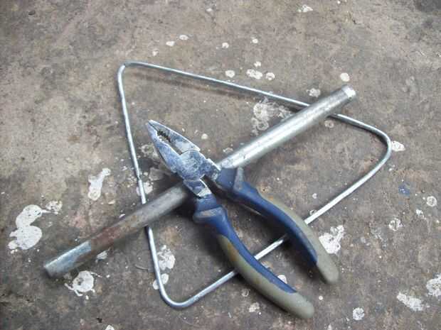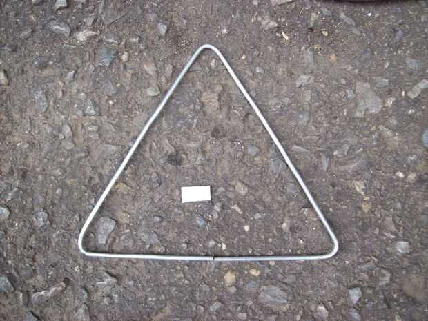 Desarma y endereza los ganchos de ropa, y con las pinzas construye un triangulo equilatero de 23 cms aprox, Une los extremos con un pedazo de lámina servira de inox, cuando ya tengas el triangulo dobla las puntas de este para formar las patas de la base.