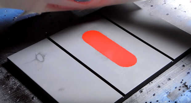 Pintar el gris de la tapa de tabla, luego enmascare el área "Inserte la placa" usando la plantilla y pintura roja. Usar toallas de papel para cubrir el resto de la mesa.