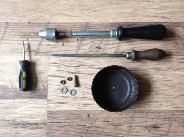 Hágale un agujero en el centro del base del trofeo (tapa de Nescafe café) utilizando el punzón (poker de agujero), utilice el taladro para hacer el agujero más grande, prueba de que el perno encaje el agujero, si luego no utiliza el archivo.