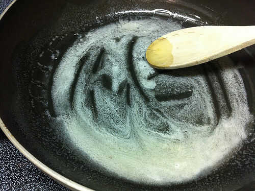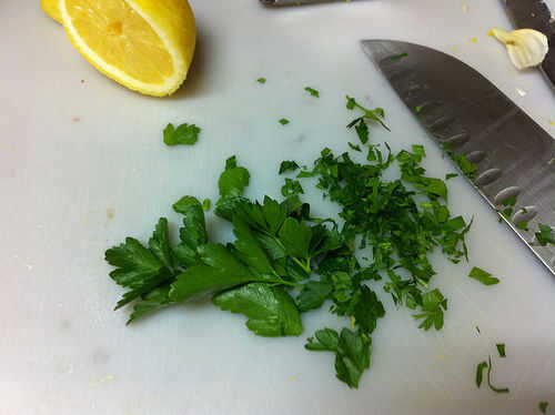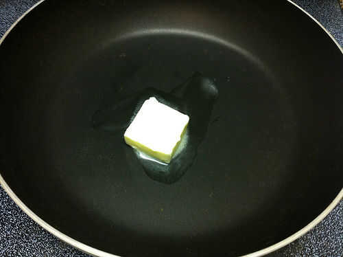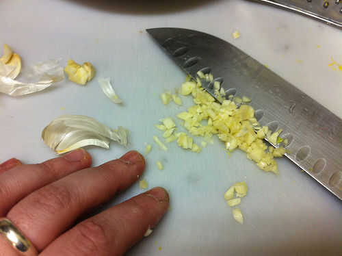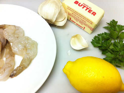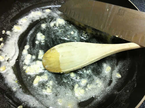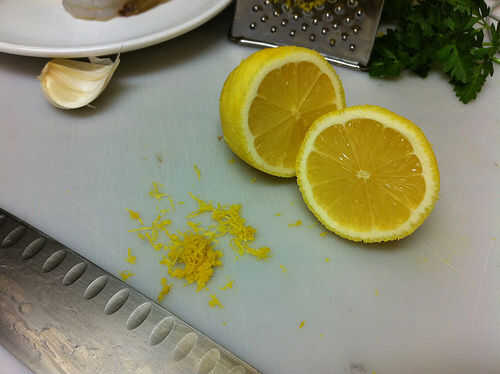 Calentar la mantequilla en una sartén amplia. Mientras la olla se está calentando, finamente picada el ajo, entonces Pele el limón. No pude encontrar mi microplane esta noche así que tuve que usar un rallador - no funcionó muy bien en todo. La mantequilla debe burbujear cuando esté caliente añadir el ajo. Revolver el ajo como agregarla, asegurándose de que usted no deje que se cocine demasiado. Una vez que el ajo se vuelve marrón, quemado y en ruinas. El sonido del agua que se escapa el ajo en la sartén debe sonar como un silbido en lugar de un chisporroteo. Si es sonido, es demasiado caliente y puede quemar fácilmente.