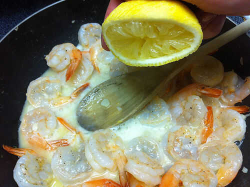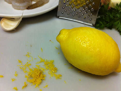 El olor del ajo debe conseguir más fuerte pero menos afilados después de unos pocos segundos en la sartén caliente. Tras unos minutos, agregue los camarones. Revolver cada cierto tiempo mientras se cocinan y no a pie. Camarón se cocine muy rápido. Añadir la ralladura de limón. Cortar la ralladura de limón por la mitad y apretar ambas mitades en la bandeja.