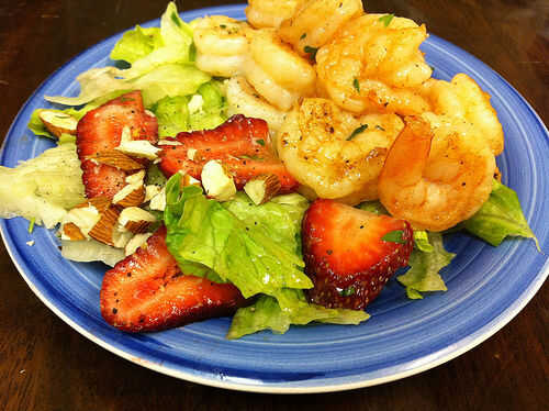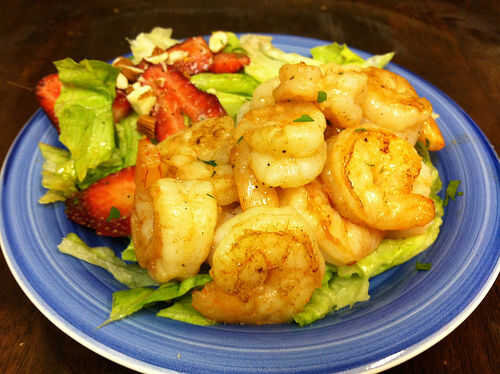 Tomé un par cucharadas de camarones cocinar líquidos y agrega a mi favoritos vinagreta; Si lo prefiere, puede añadir un poco de vinagre de champagne y un toque de aceite de oliva. También añade las almendras picadas y rebanadas de fresas un poco de brillo en la ensalada. Sí, fresas pueden trabajar con camarones si los otros sabores son balanceados adecuadamente.