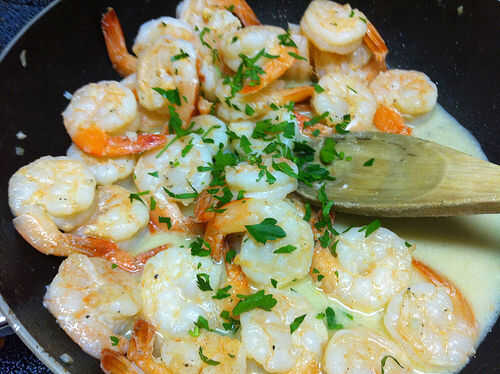 Picar el perejil y añadir a los camarones. Moler en un poco de pimienta negra, si se utiliza. El camarón se cocinado cuando apenas has convirtieron opacos a través de todo el camino.