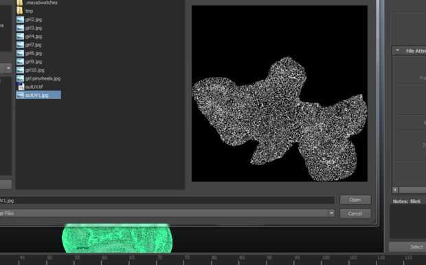 Elegir nuestra UV mapa-guarda como outUV.jpg o outUV.tif (Foto 5 y 6). Vemos el resultado en la foto 7, cuando nuestro archivo de mapa UV consigue envuelto alrededor del modelo. Básicamente crea una piel que directamente podemos trabajar, usando el pincel de pintura 3d por ejemplo.