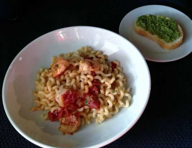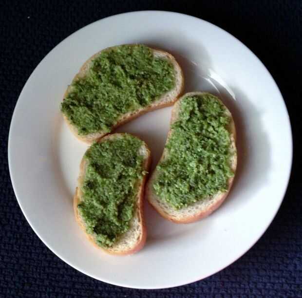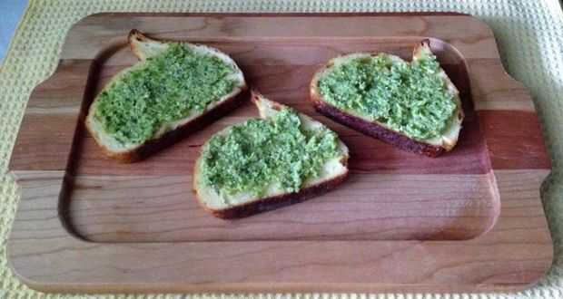 Aquí sirve el pesto en tostadas para acompañar nuestra scampi de camarones, hecho también con paisajes, cena de pastas. Esperemos que este año buscan algunos paisajes ajo refrigerio también, disfrutar!