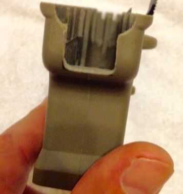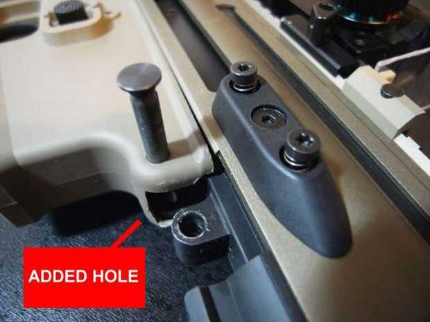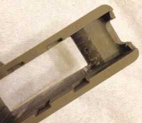 Utilice una herramienta Dremel para cortar una muesca en la parte delantera del receptor más bajo aproximadamente el tamaño de la zapata de pin receptor inferior en la parte inferior del montaje de barril (fotos superior, medio e inferior). Debe tener cuidado en este paso porque si arruinara, arruinaría el recibidor inferior. Recomiendo conseguir un receptor más bajo de reemplazo de VFC por si acaso.