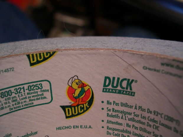 4) cinta ducky. Podría responder a aquellos que dicen "es la cinta de conducto , ya tard", por embarcarse en un largo y enrollado a un lado, en la historia de las cosas. Si el nombre de pato original vino de hacerse del pato del algodón, se utiliza para reparar vehículos anfibios DUKW, es ser resistente al agua y así sucesivamente, pero bueno, Wiki que por sí mismo. Llama ducky porque hay una foto de un pato en él.