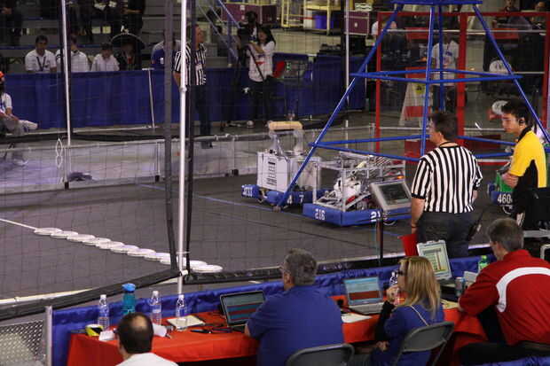 Cuando llegamos en el óvalo olímpico el jueves para el regional de FRC canadiense occidental, nos puso inmediatamente a trabajar instalar nuestros ganchos recién hechas. Entonces preguntamos a algunos otros equipos ayuda con nuestra programación, que estaba todavía no comportando correctamente, por suerte para nosotros equipo 4105 (creo) nos dio una mano (de cerca de 5 horas). Luego probamos una práctica ronda, pudimos poner a prueba todos los sistemas incluyendo los ganchos, que todos nos sorprendimos al ver perfectamente la primera vez que trabajó. Sin embargo una mal conectado la cámara GoPro cayó en la electrónica y todo lo frito. Después otro par de horas con los primeros mentores fijamos la electrónica. Por este tiempo se terminó el primer día.