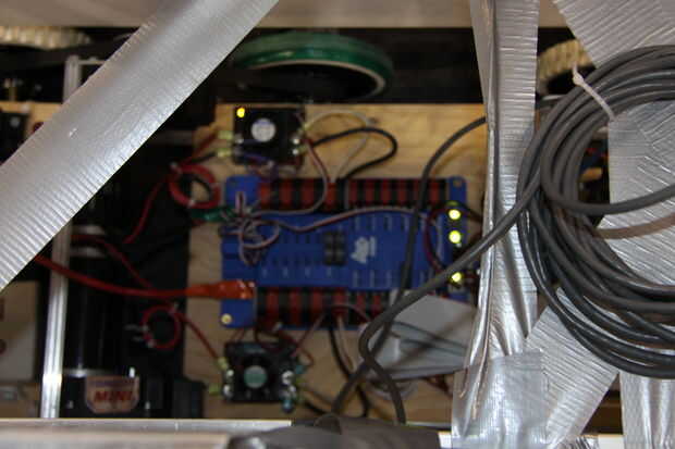Esto era una construcción muy larga y complicada, pero no somos constructores de robot muy experimentados, por lo que nuestros métodos de construcción eran muy simples. La base del robot era aluminio construido de la forma "X" rieles y pernos. La parte superior, antes del accidente, fue hecha de madera contrachapada y una placa giratoria (gabinete) de Susan perezosa. Utilizamos las herramientas en nuestra tienda de madera de las escuelas principalmente de la Sierra de mesa, taladro y sierras manuales. Después del accidente recurrimos a métodos incluso más simples para volver a construir el robot, cinta pato, abrazaderas de plástico y algo de suerte.