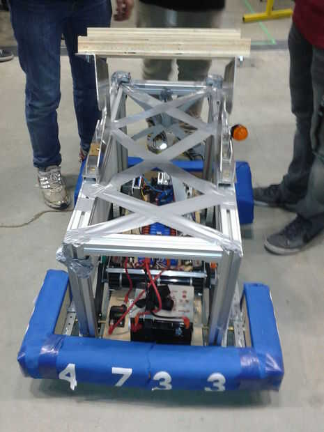 Cuando llegamos a ambas piezas de nuestro trabajo previamente robot de los hoyos que nos dimos cuenta que el problema era peor de lo que parecía, y parecía bastante malo. El marco inferior era desalineado y los soportes de esquina habían doblado o roto, y la electrónica una vez más no funcionaban. Esto significa que necesitaríamos varias horas jugando y apretar, junto con piezas de repuesto de algún otro equipo, y un montón de mentor ayuda a conseguir algo que incluso podríamos conducir. Esto fue cuando diseño salió de la ventana y comenzó el montaje de jurado (o Jerry?).