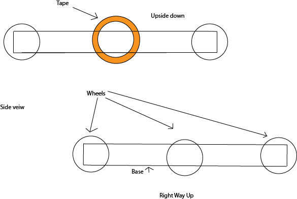 En este punto entramos una vez más en un partido sólo para aprender que misteriosamente nuestro robot era solamente mover hacia delante y hacia atrás, no gira lo que se suponía. Pensamos que se trataba de un problema de codificación, pero resultó que había colocado nuestro bastidor boca abajo, para que los wheals del mediados eran más altos que la parte delantera y trasera, lo que significa que en lugar de un giro en una máquina de manipulación de la moneda de diez centavos que ahora intentábamos hacer una gran caja rebelde. Hemos solucionado esto envolviendo cinta aislante alrededor de las ruedas varias veces hasta que tuvimos una capa lo suficientemente gruesa que la media rueda fue una vez más tocar el suelo. Nuestra dirección fue restaurada, la última cosa a hacer era amarra nuestros topes (el relleno en los lados del robot) en un más seguro lugar y cruzan los dedos.