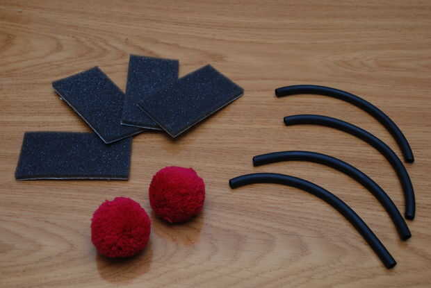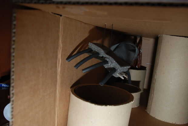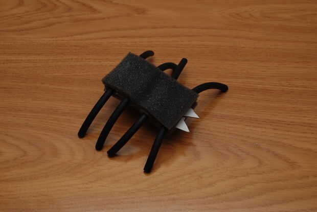 Mi araña es hecho simplemente por cuatro tubos de goma y cuatro pegatinas de espuma. Dos triángulos de cartón actúan como dientes. Olvidar los pompones rojos de la foto, no lo utilizó. Estoy seguro que será más realista que era.