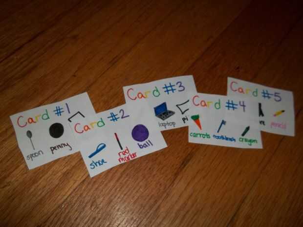 En primer lugar, usted tendrá que cortar el papel blanco en rectángulos de 3 x 2 pulgadas. Te recomiendo que hagas más de 20. Hará el juego más divertido y emocionante. Etiqueta las tarjetas en creyones o marcadores "Tarjeta #1", "Tarjeta #2", "Tarjeta #3", etc.. Una vez que haya terminado con el etiquetado de las tarjetas, dibujar cosas simples que usted puede encontrar alrededor de su casa como lápices, juguetes, etc.. Si usted está haciendo esto para el coche, entonces poner objetos como tipos de coches o edificios. Entonces la etiqueta los elementos en letras pequeñas debajo del dibujo.