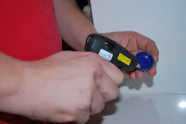 Tomar la tapa de la botella que había fijado a un lado, utilizar la pistola de pegamento para hacer un pequeño anillo de goma alrededor adentro borde de la tapa de la botella.