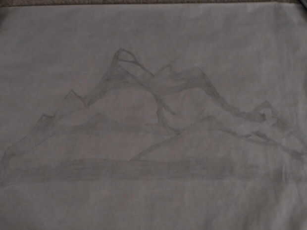 Mano del bosquejo sus montañas. El borde inferior de las montañas, necesitará ser un borde recto. Es más fácil ver lo que estará cortando hacia fuera si usted sombra en lo que permanece. También desea esbozar tres árboles.