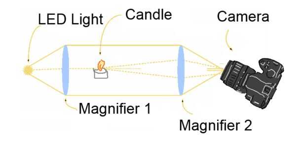 La idea básica es que usted necesita obtener algo caliente como una vela en medio de unos rayos de luz paralelos - luego esos rayos a casi un punto de noquear a mitad de los rayos que no se centran exactamente paralelo para arriba. La primera lupa página hace la luz desde el paralelo del LED (collaminated) y luego el otro enfoca la luz hacia atrás otra vez. La cámara se coloca derecha donde la luz se enfoca y ángulo al lado para que algunos rayos no paralelos son bloqueados por la abertura.