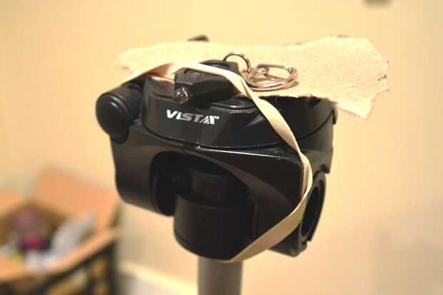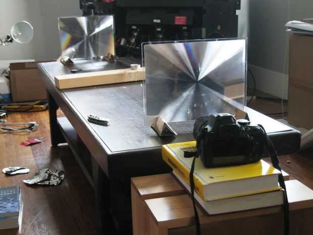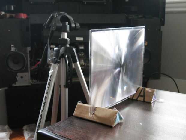 La cámara debe sujetarse para arriba así que ese objetivo sólo toca el punto que enfoque los rayos de la luz. Puedes usar un trípode, o unos libros y un taburete o silla como yo lo hice al principio.