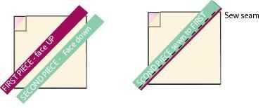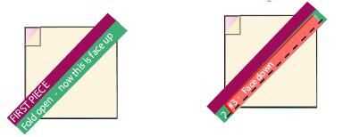 Doble abierto la tira por lo tanto ahora boca arriba. Pieza siguiente lugar boca abajo encima de una de las tiras y coser la costura. Luego doblar la abierta. Continuar hasta la mitad del bloque está cubierta a la esquina. Tapa bloque 180° para que pueda trabajar en la parte que no está cubierta con schnibbles... continuar schnibbles de costura hasta llegar a la segunda curva.