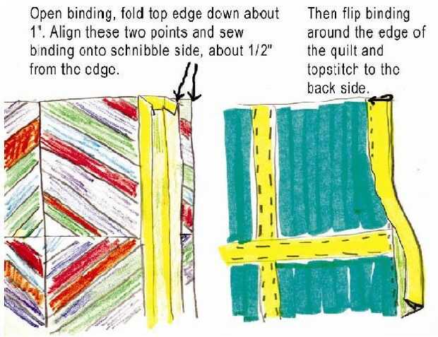 Se unen los bordes con la misma tela de encuadernación... Se unen el borde. Abrir un borde de la tira y ponga boca abajo en el lado del schnibble de la colcha, lado largo alineado con el borde de la colcha. Si te retiras el borde estrecho "superior" de su enlace por cerca de 1 pulgada, hará que una esquina terminada cuando todos los cuatro enlaces se unen. (también tienes que doblar el borde estrecho "inferior" al final de su enlace. Coser todos los cuatro enlaces en el borde de su edredón.