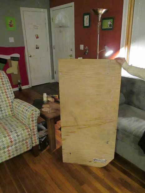 Tenía un viejo pedazo de madera contrachapada dañado de una tabla temporal. Era no hacer nada pero ocupando espacio. Estaba decidida a en su mesa, de alguna manera.