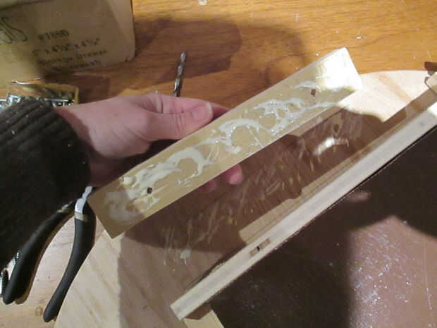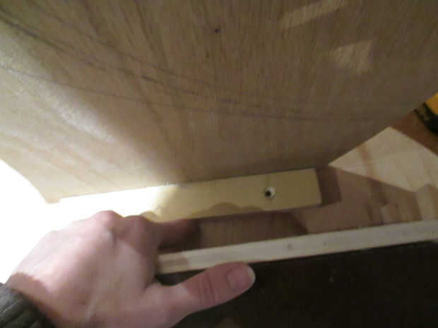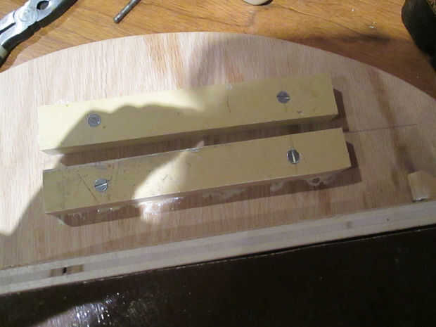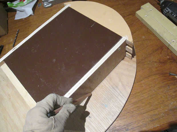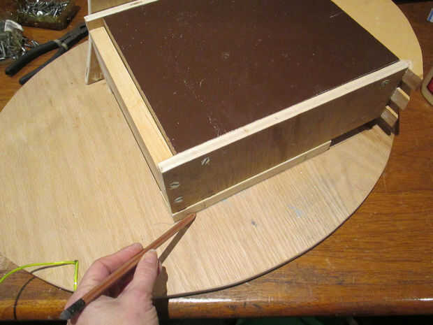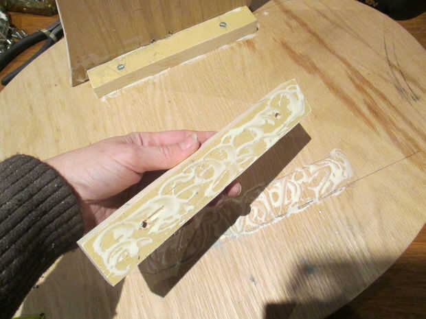 No podía ir demasiado profundamente en la elipse de la madera contrachapada así porciones de pegamento y pruebas antes de la final tornillo a la mesa.
