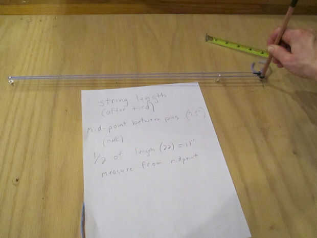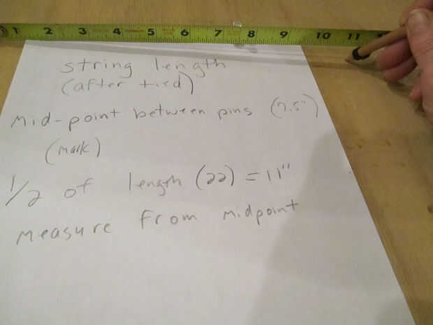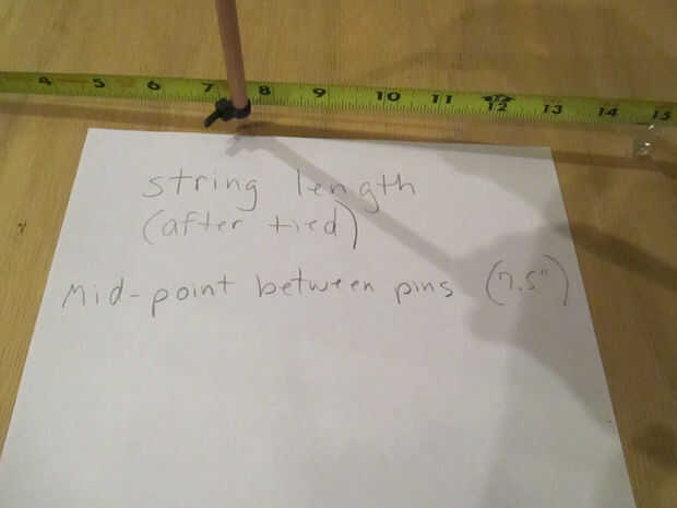 5. que necesitamos para encontrar la longitud de la cadena, después de atados, para dibujar la elipse. Encontrar el punto medio entre las dos clavijas en la madera. Marque si desea, valor de la nota.