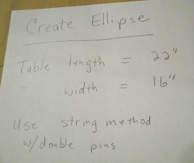 Si usted tiene un pedazo grande de papel del tamaño de la elipse previsto, es más inteligente a este perno encima de la madera y dibujar la elipse en el papel, luego doblar la elipse en mitad y mitad otra vez para verificar la simetría. Este recorte y usar como plantilla. También es mejor usar una cadena no flexibles. Hilo se puede estirar como tirado pero el azul se presentó muy bien en las fotos por lo que era bueno para fines de ilustración.