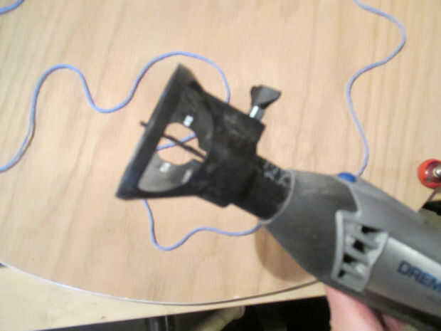 Mis brocas Dewalt son demasiado grandes para la pequeña ranura que contiene EL alambre perfectamente y mi Dremel no tiene un router bits, así que estoy intentando lo que se debe no a menos que desean un buen desafío y están bien con el movimiento rebelde ocasional de la herramienta - estoy usando un pequeño taladro bit extendido justo pasado el collar de montaje y corte guía cosita. Es posible que si subir la velocidad muy alta viajará más a su voluntad. Primero probé un poco en un pedazo fino de madera contrachapada.