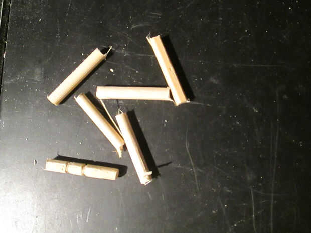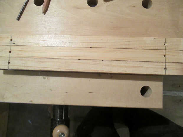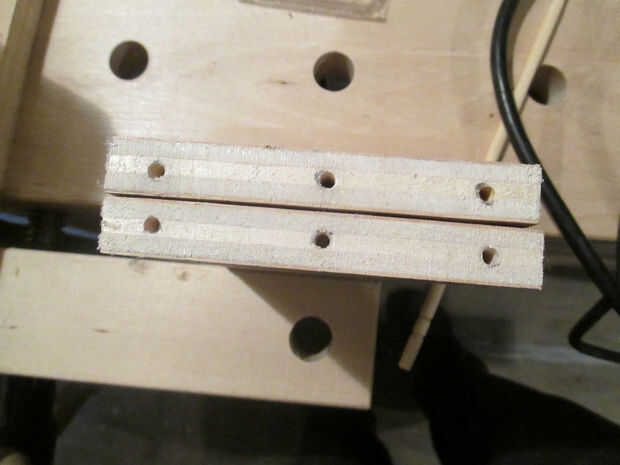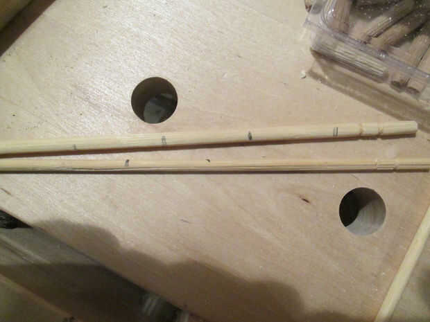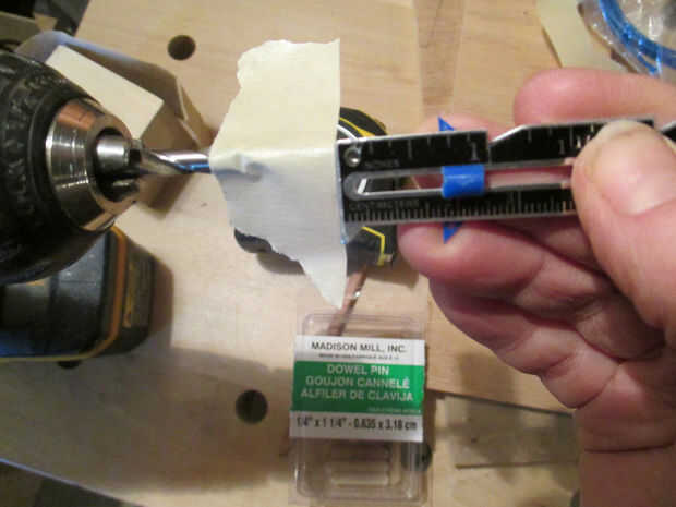 Temía que si taladré un agujero mucho más grande en la madera que la integridad del agujero no sería tan buena, así que corté hasta mi propio pasador en lugar de utilizar los pernos de pasador de 1/4" pre-fab. He utilizado palillos redondo chop que eran un poco más delgado.
