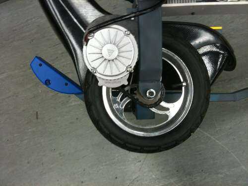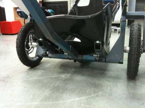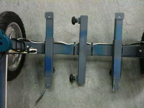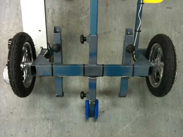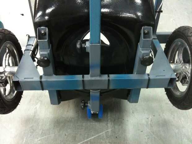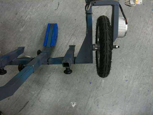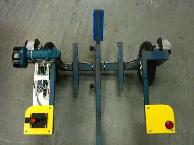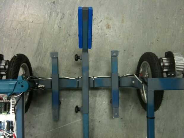 Hay un tubo en forma de U sobre cada rueda al perno de la rueda y los motores, y una barra entre éstos como miembro principal. Al principio teníamos los refuerzos en su lugar (piezas de forma triangulares) pero la parte inferior la barra dobladora comenzó. Asegúrese de que el miembro principal es resistente y se refuerza a la forma de la rueda U.