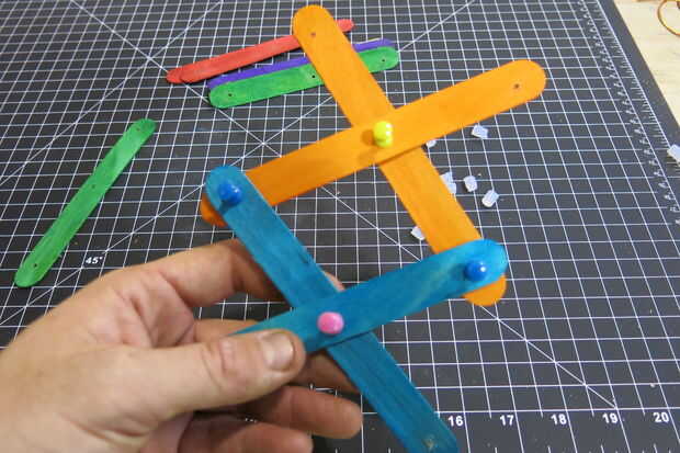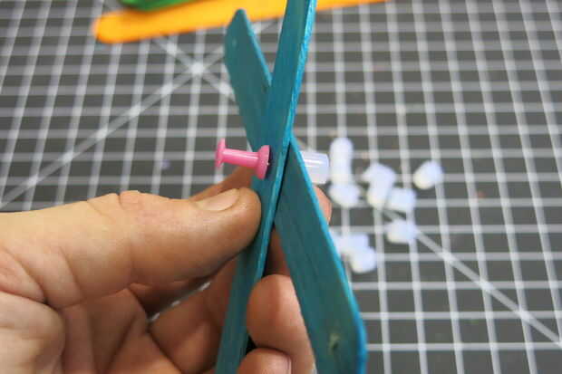 Tiempo para conectarlos todos juntos! Alinee su arte palos así y empuje el pasador a través y en para el palillo del pegamento en el otro lado. A algunos les gusta hacerlo con clavitos de metal, pero este método es ideal para el rango completo de movimiento sin capturas.