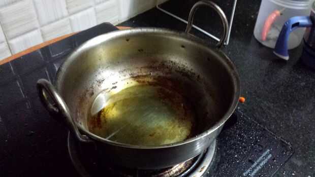Tomar una sartén, calor en a fuego lento y añadirle 100 ml de aceite de sésamo.