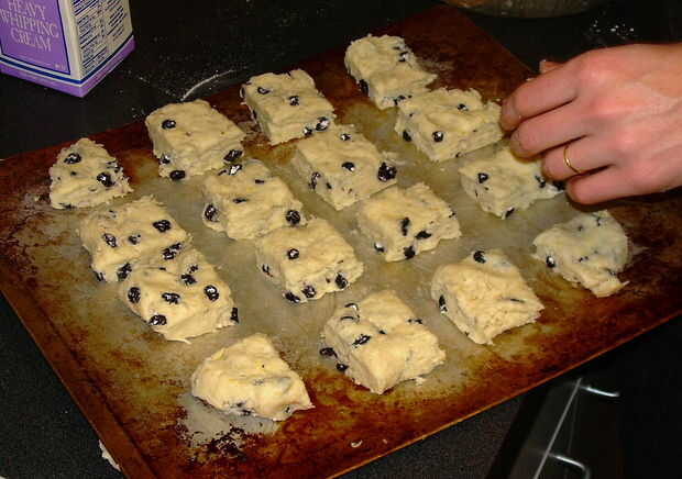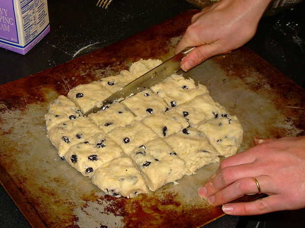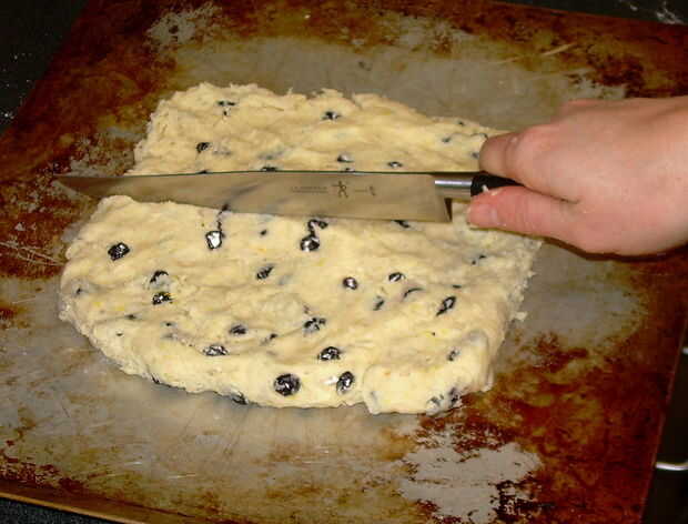 En este caso estoy cocinando dos lotes cada 1.5 x la receta normal, así que decidió hacer un cuadrado. Cuando una receta de tamaño estándar de la hornada elegir hacer un círculo más tradicional de bollos en forma de cuña de pastel.