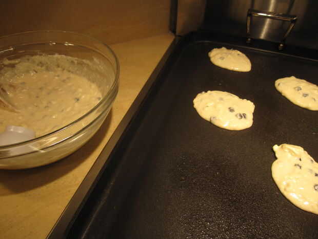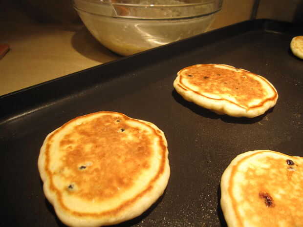 4. Vierta 1/4 taza de mezcla sobre una sartén caliente. Cocine hasta que la tapa tiene burbujas y los bordes aparecen cocinados.