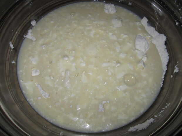2. mezclar el huevo, leche, queso crema, mantequilla y vainilla en un tazón. La masa tendrá pequeños trozos de queso crema.