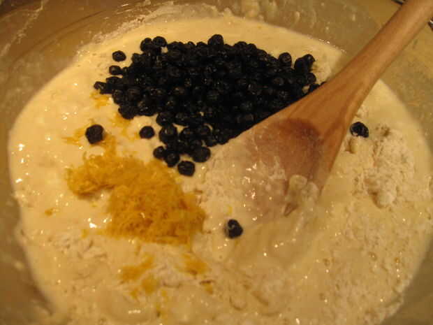 3. Añadir los ingredientes líquidos a la seca. Añadir la ralladura de limón y arándanos. Revuelva hasta que se humedezcan.
