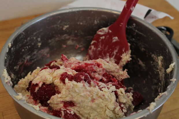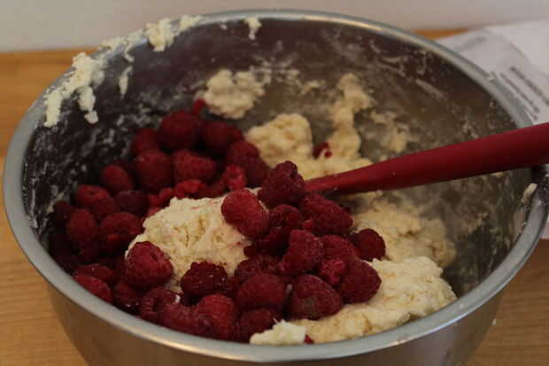 Luego de la descarga en las frambuesas e incorpore los cuidadosamente. No te preocupes si las frambuesas rompen demasiado, todavía estará bien.