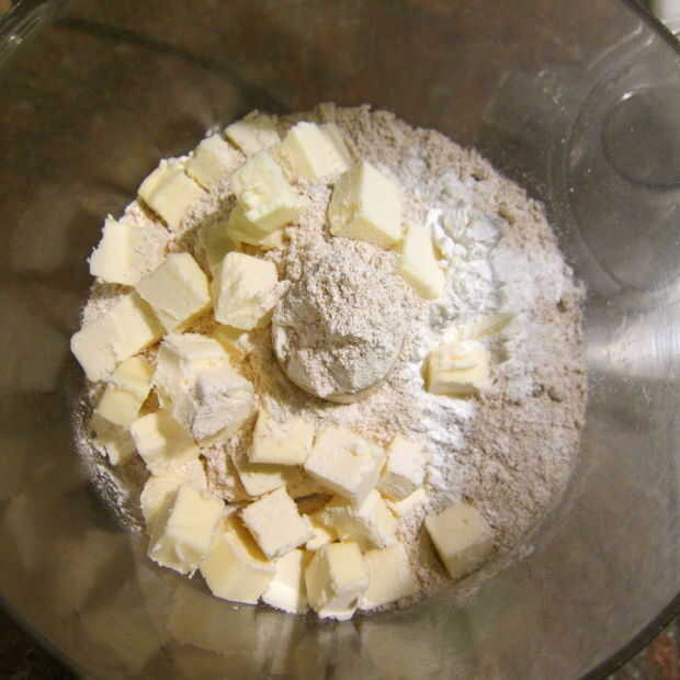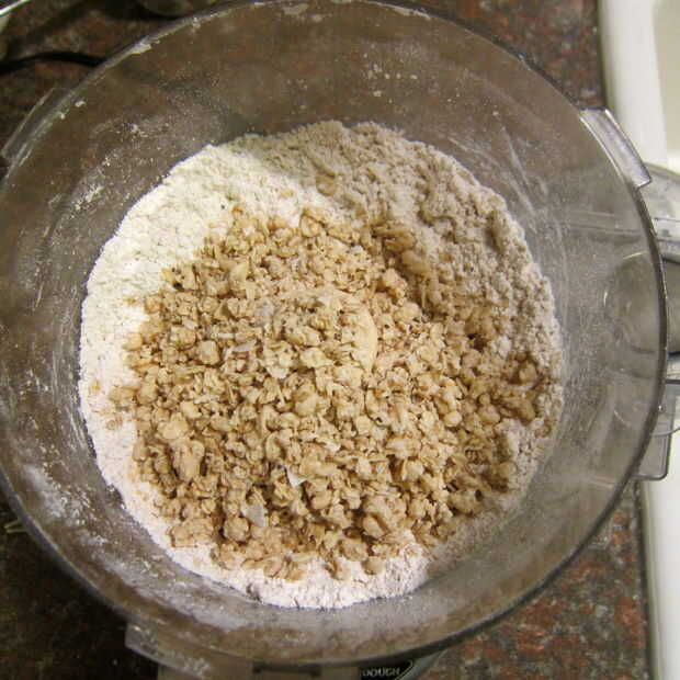 En el tazón de un procesador de alimentos agregue harina, azúcar, polvo de hornear y la mantequilla fría en cubos. Pulse varias veces hasta que son pequeños trozos de mantequilla. Añadir granola y pulso para combinar.