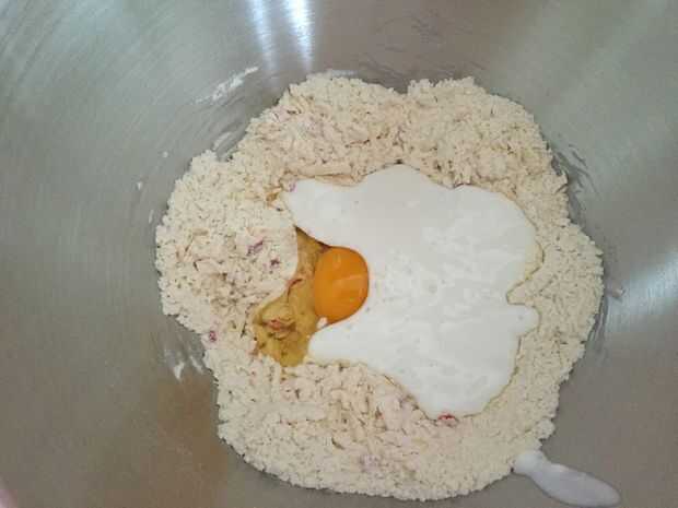 Añadir el huevo y el yogur y mezclar a una masa pegajosa.