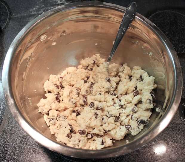 Añadir el huevo y la leche a la masa, coge la palanca de mezcla y en ER. Raspe los lados y mezclar hasta que comience a bulto juntos. (ver la foto de arriba)