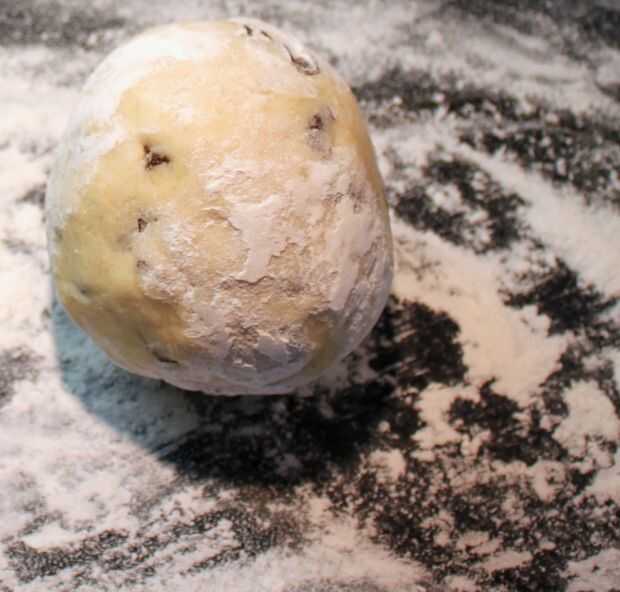Dar a la masa un poco de la vuelta a través de la harina para sacar lo peor de la adherencia y con la palma y la palma de la mano, aplanar la bola de masa un poco.